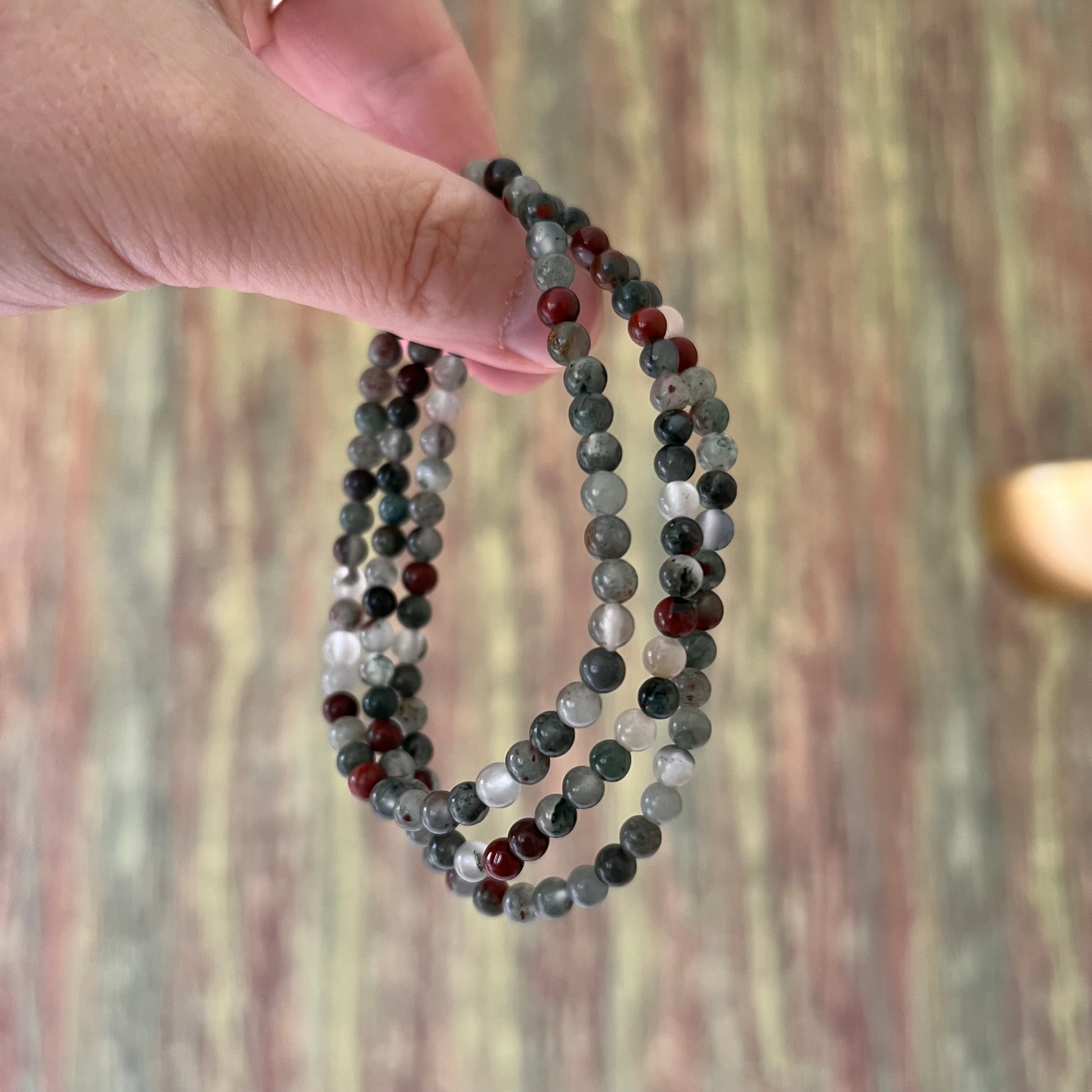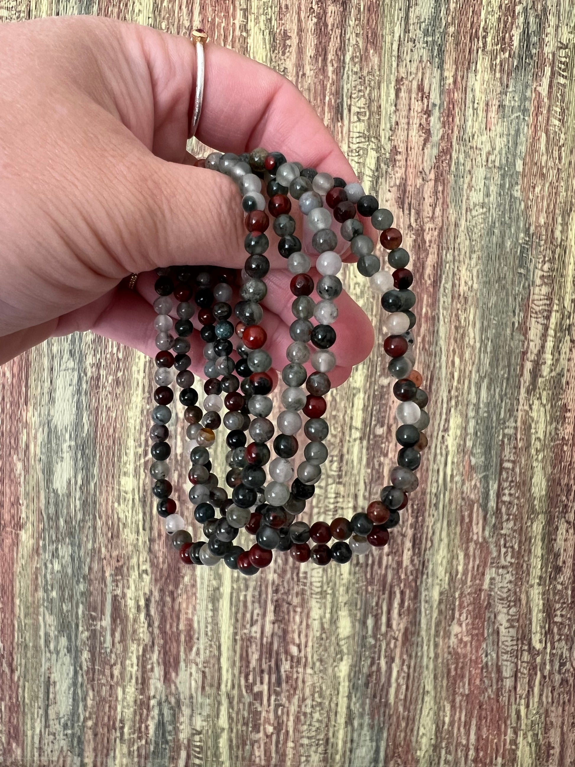 Dieses kraftvolle Armband aus echtem afrikanischen Bloodstone (auch Heliotrop genannt) besteht aus runden, polierten Edelsteinperlen (ca. 4 mm), aufgefädelt auf einem elastischen Band. Die dunklen Grüntöne mit feinen roten Sprenkeln verleihen dem Armband eine markante, erdige und zugleich schützende Ausstrahlung – jedes Stück ein Unikat.