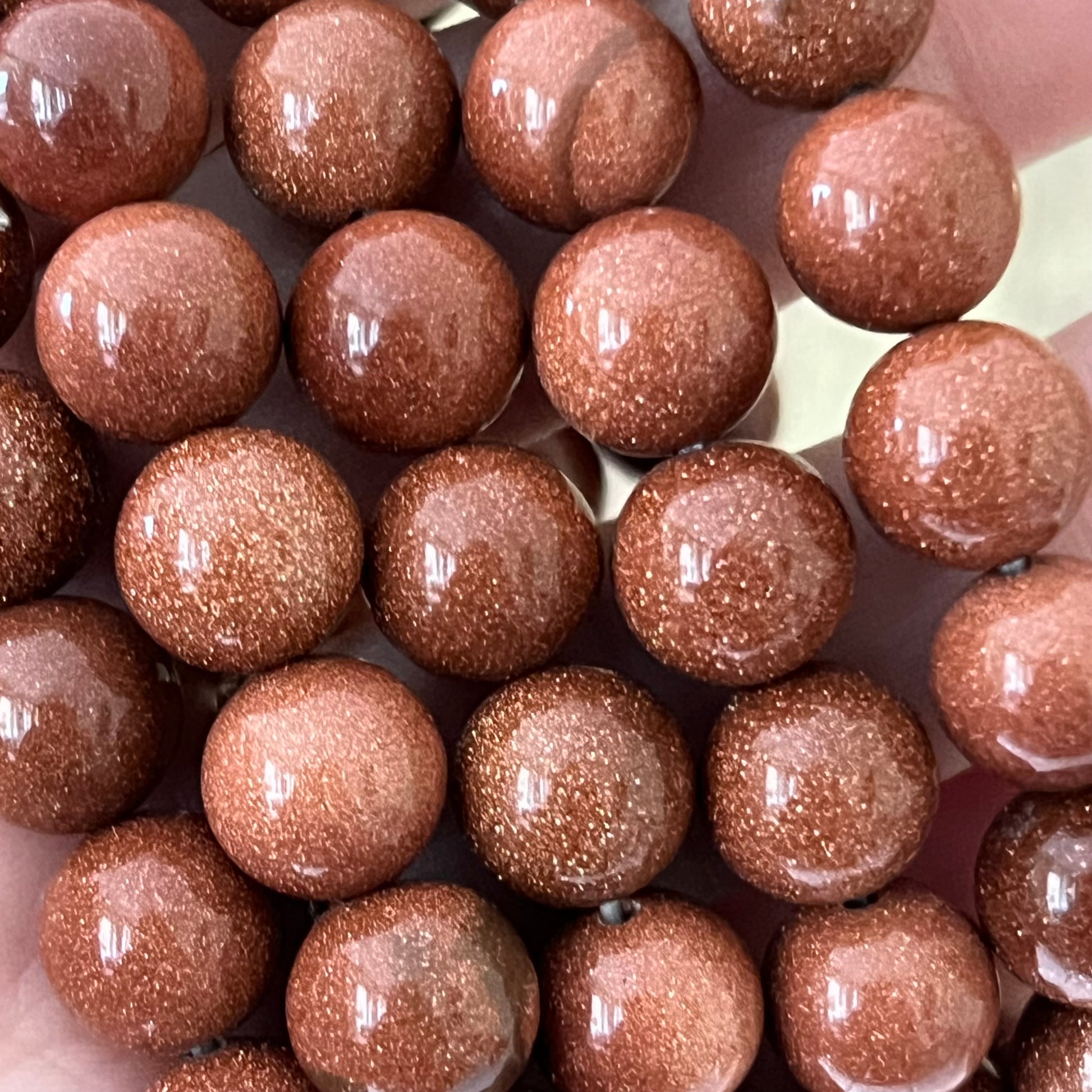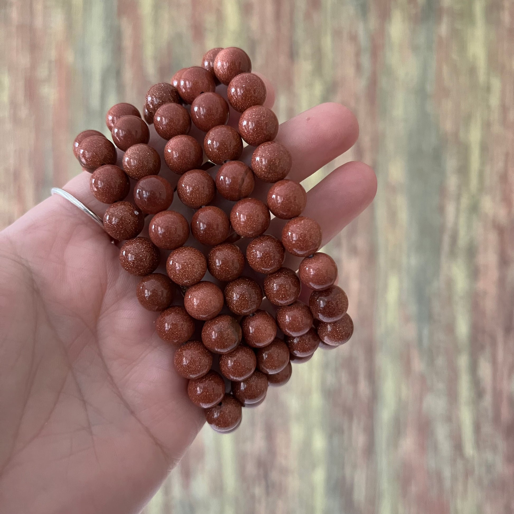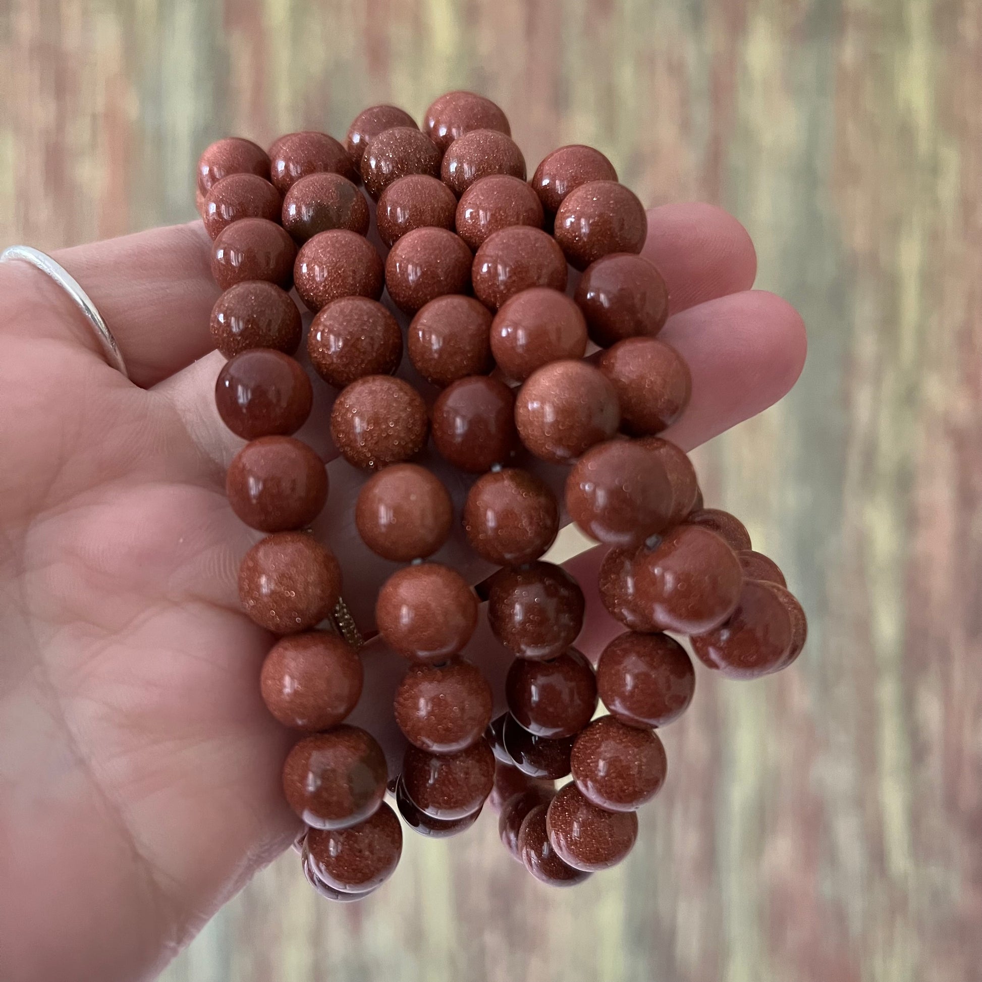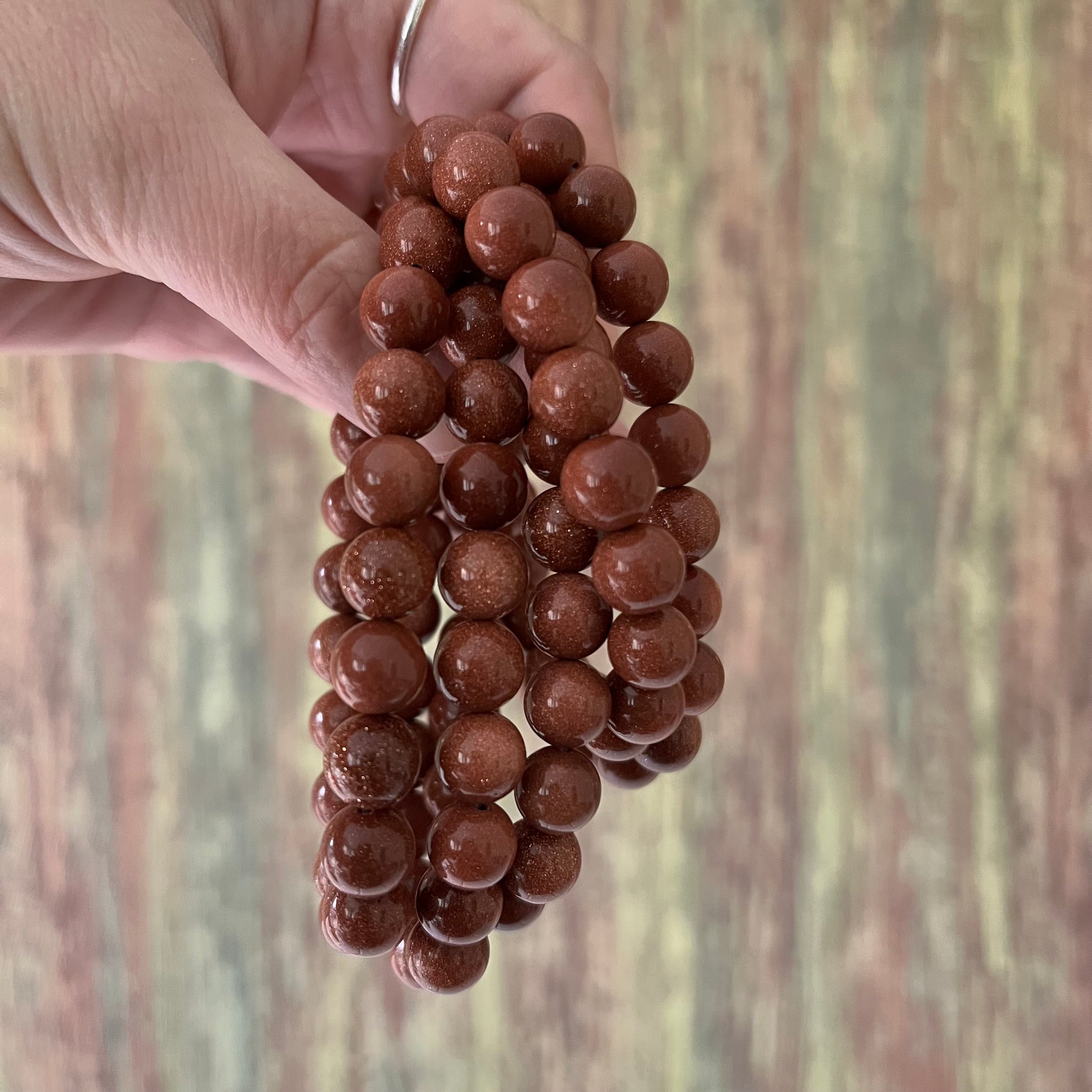 Dieses edle Armband aus goldenen Sandstein besteht aus glatten, polierten Edelsteinperlen (ca. 10 mm), die auf einem elastischen Band aufgefädelt sind. Der warme, goldbraune Ton mit unzähligen glitzernden Partikeln sorgt für einen faszinierenden Schimmer – besonders im Licht entfaltet der Stein seine volle Magie.
