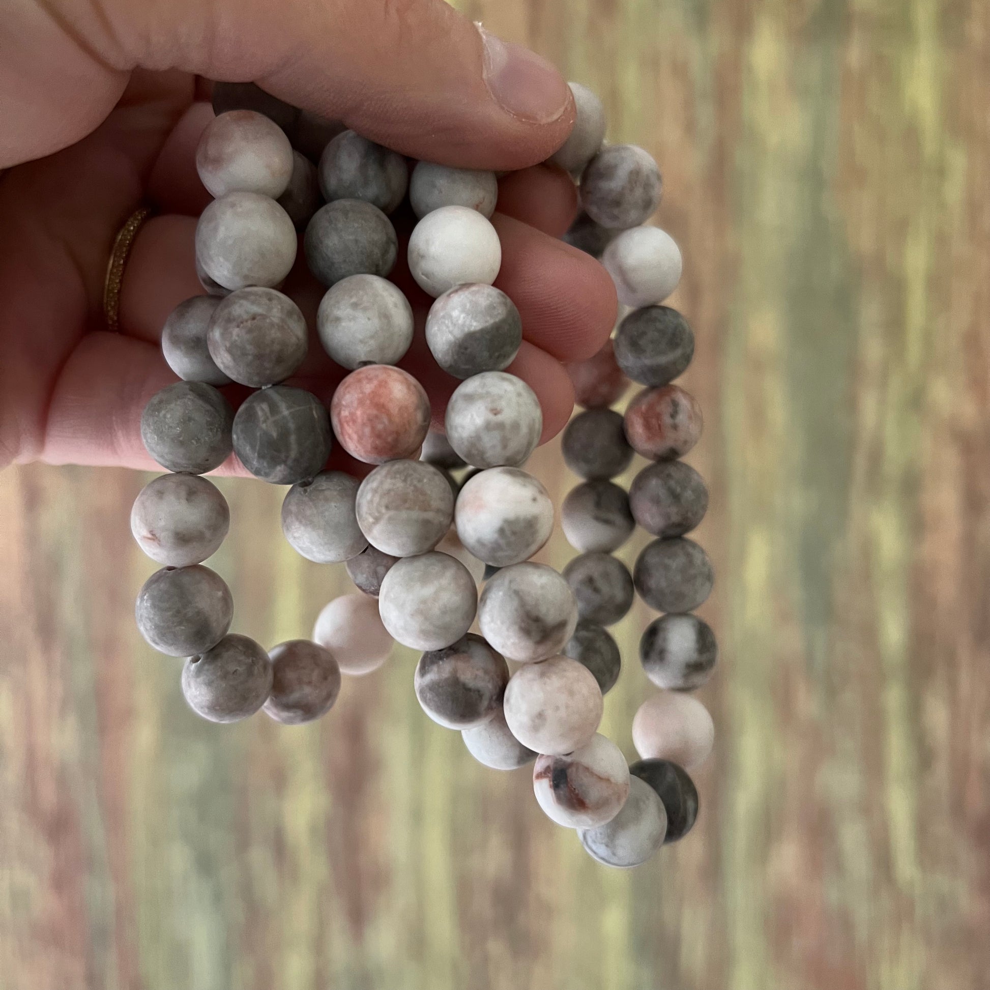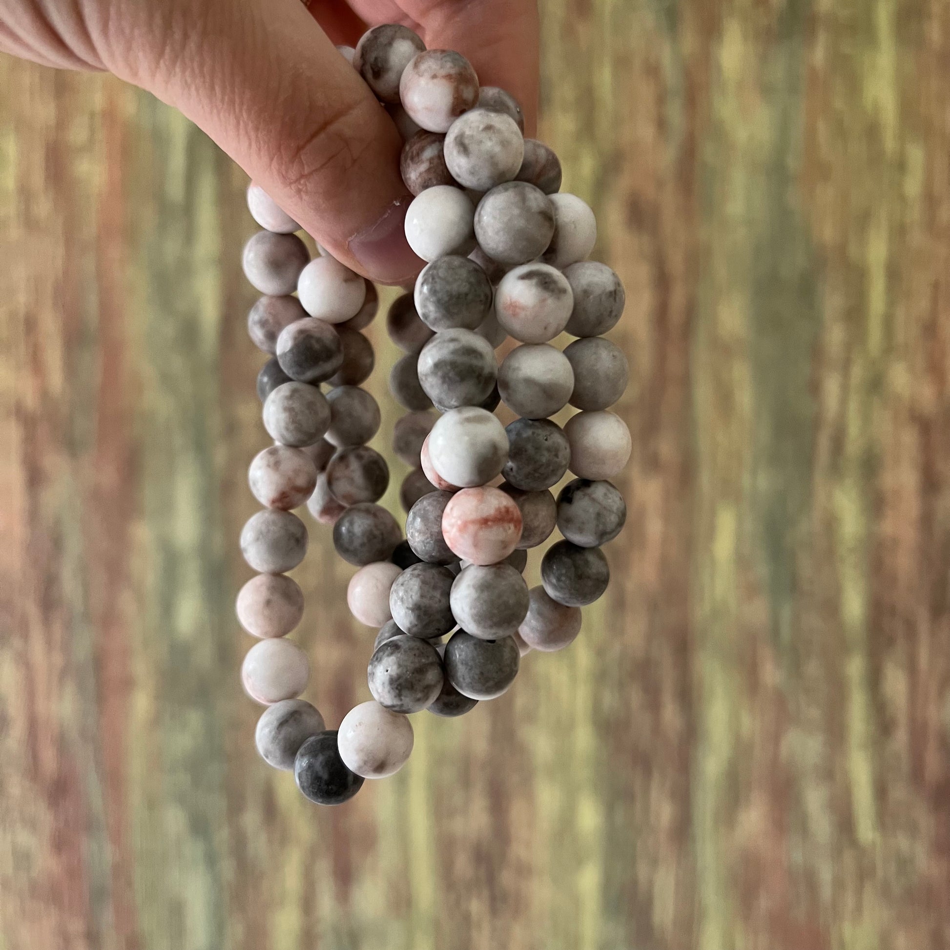 Dieses markante Armband aus echtem Pink Zebra Jaspis besteht aus matten, polierten Edelsteinperlen (ca. 10 mm), die auf einem elastischen Band aufgefädelt sind. Das auffällige Zusammenspiel von Rosa-, Grau- und Weißtönen erinnert an zarte Marmormuster und macht jedes Armband zu einem echten Einzelstück der Natur.