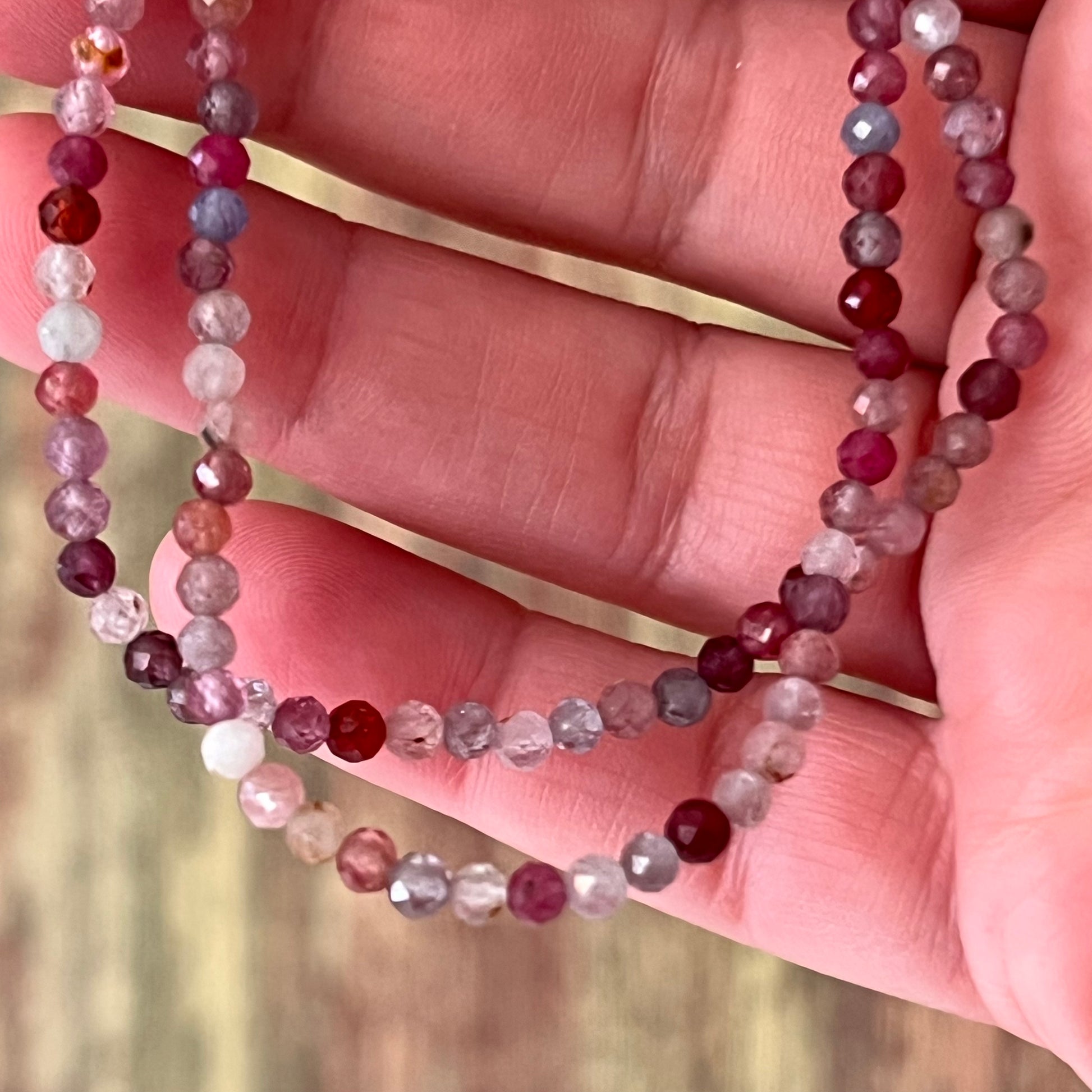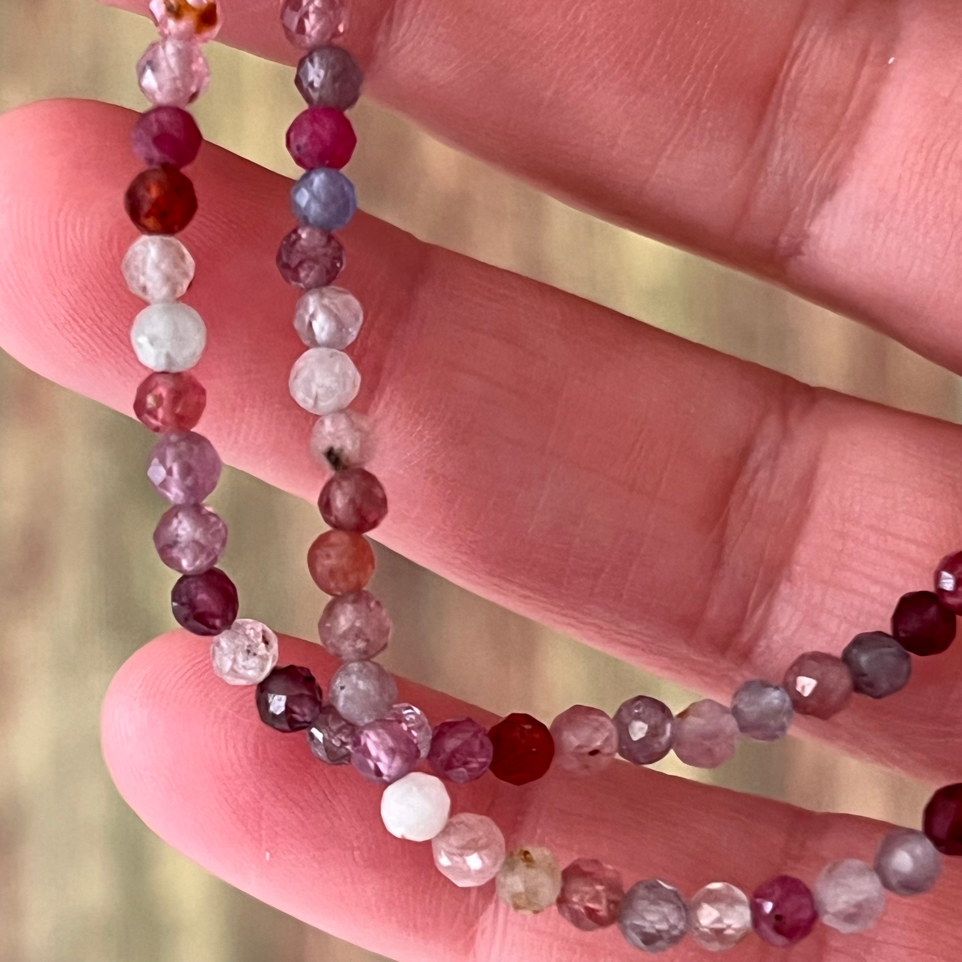 Dieses exquisite bunte Spinell-Armband besticht durch seine fein facettierten 3 mm Kugeln aus echtem Spinell. Die abwechslungsreiche Farbwelt reicht von lebhaften Rottönen über tiefe Violett- und Blautöne bis hin zu warmen Erdtönen – jedes Armband ein einzigartiges Farbspiel und ein persönliches Statement.