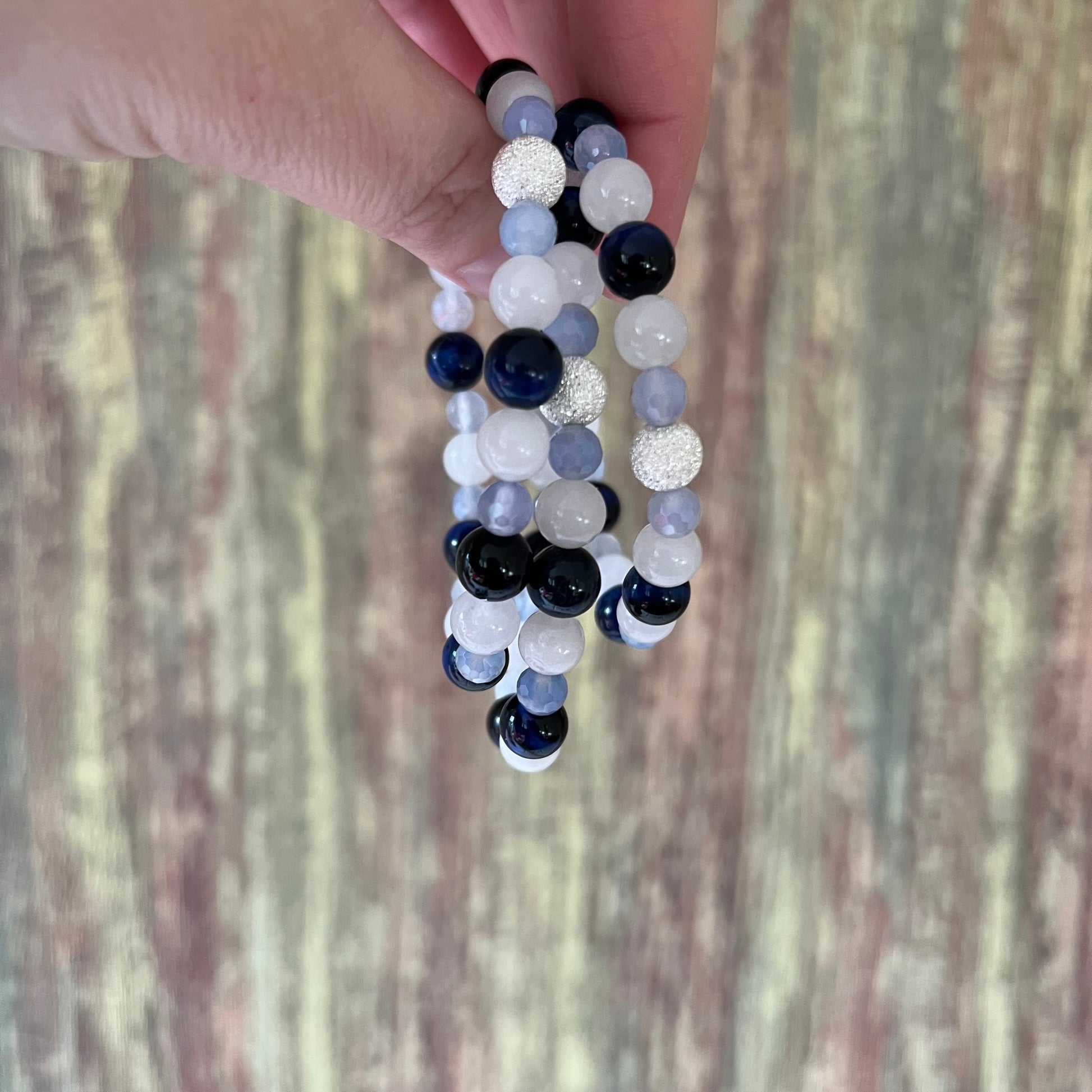 Dieses Edelsteinarmband verbindet sanftes Licht, tiefe Blautöne und feine Glitzerakzente zu einem eleganten, modernen Schmuckstück. Der 8-mm-Mondstein bildet mit seinem milchigen Schimmer den ruhigen, klaren Gegenpol zum dunkelblauen Tigerauge, das durch seine charakteristische Lichtbewegung eine mystische Tiefe erzeugt.