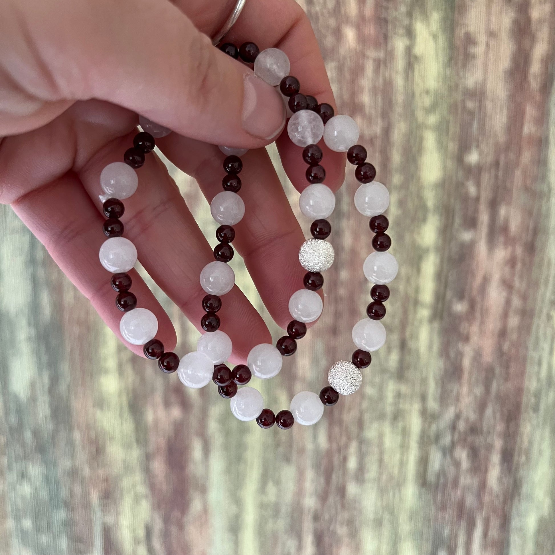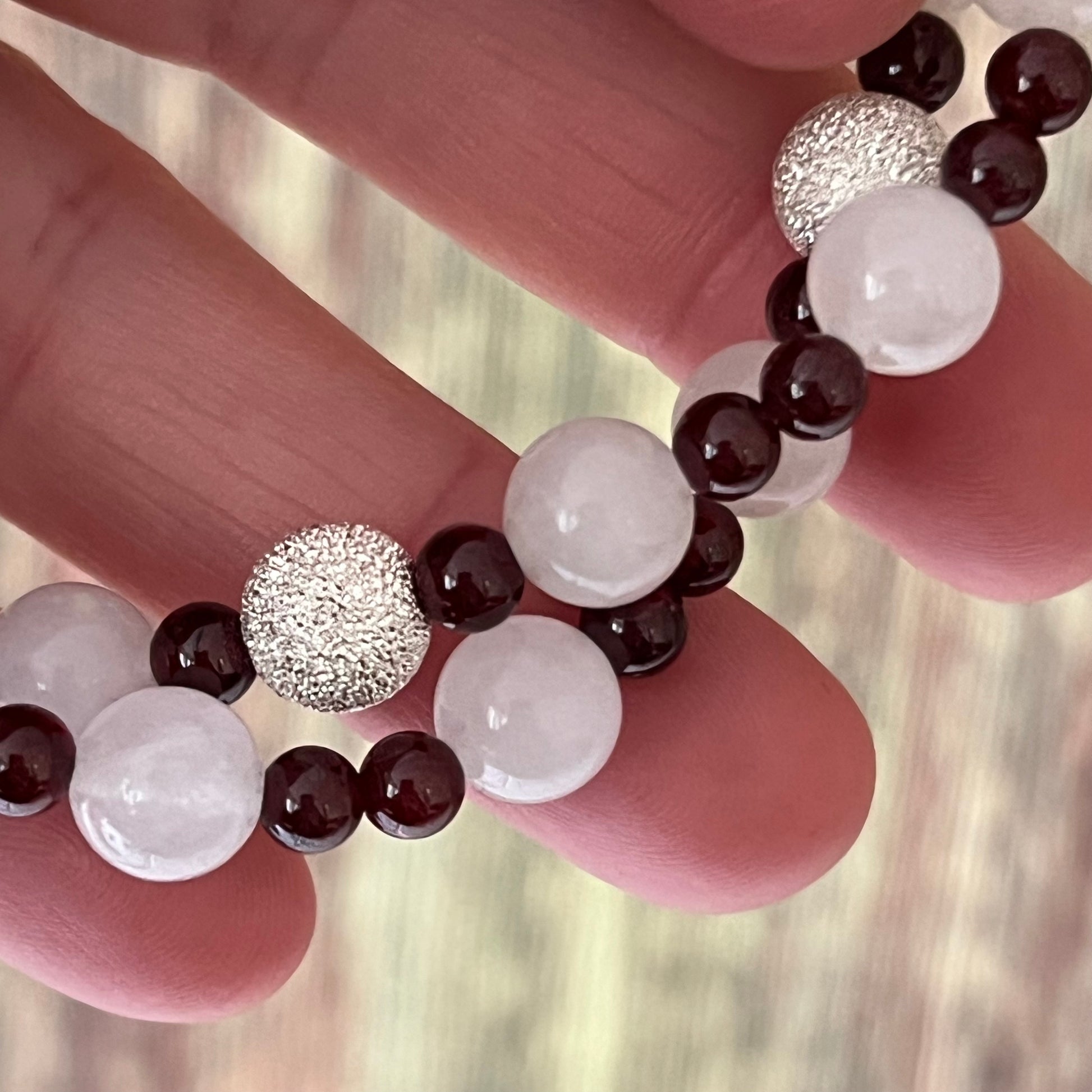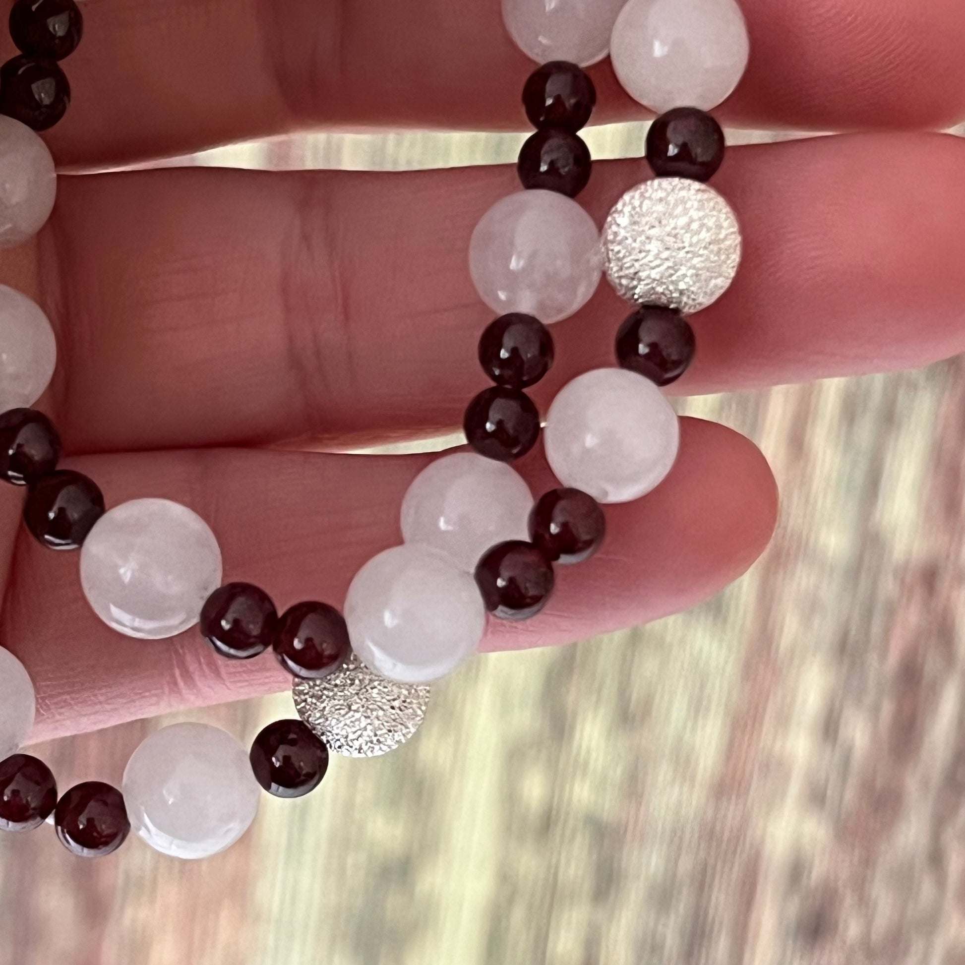 Dieses Edelsteinarmband kombiniert die ruhige, klare Ausstrahlung des Mondsteins mit der tiefen Wärme des Granats. Die 8-mm-Mondsteine verleihen dem Armband einen sanften, lichtreflektierenden Schimmer und bilden die harmonische Basis des Designs. Die zarten 4-mm-Granatperlen setzen edle, weinrote Akzente, die dem Schmuckstück Tiefe und Eleganz verleihen.