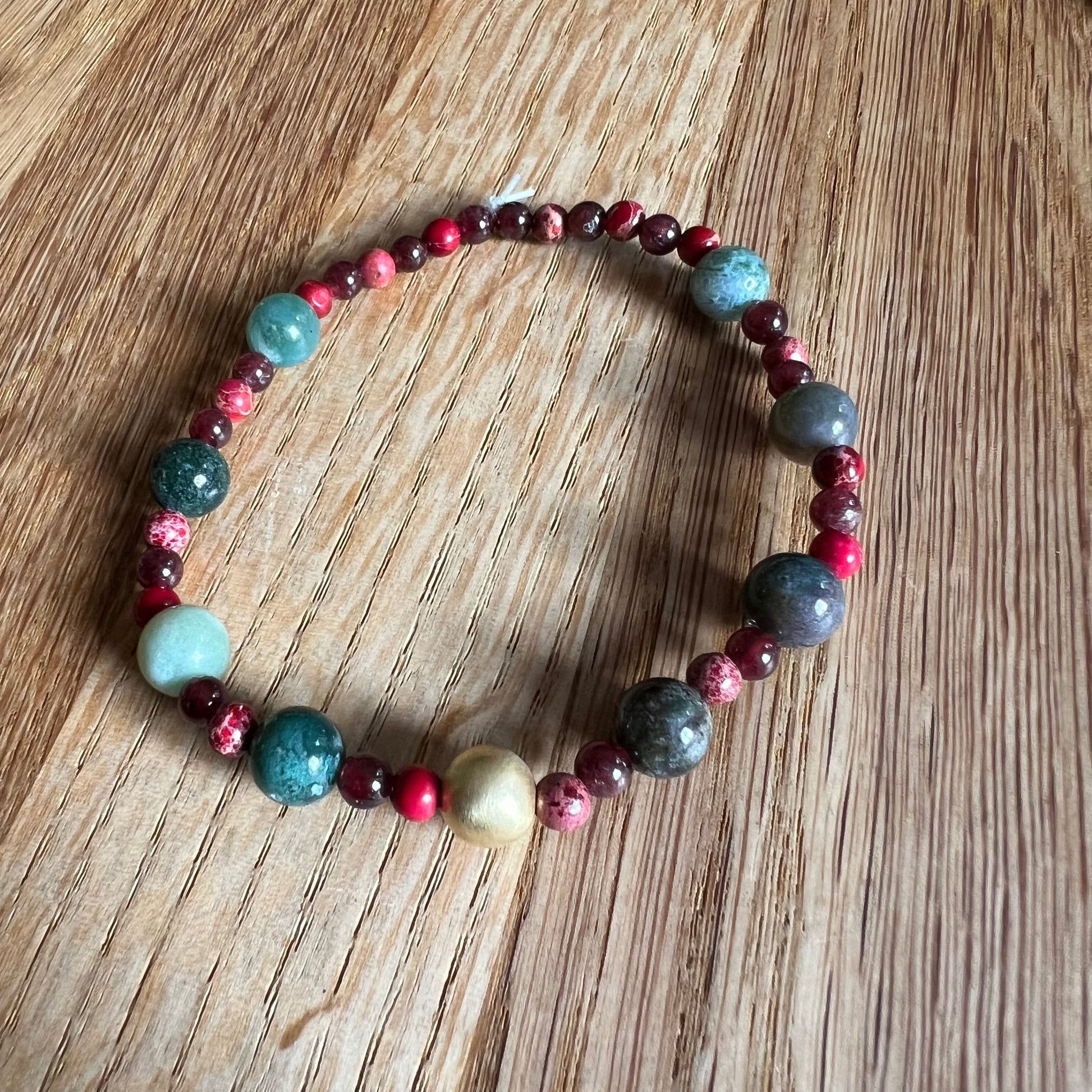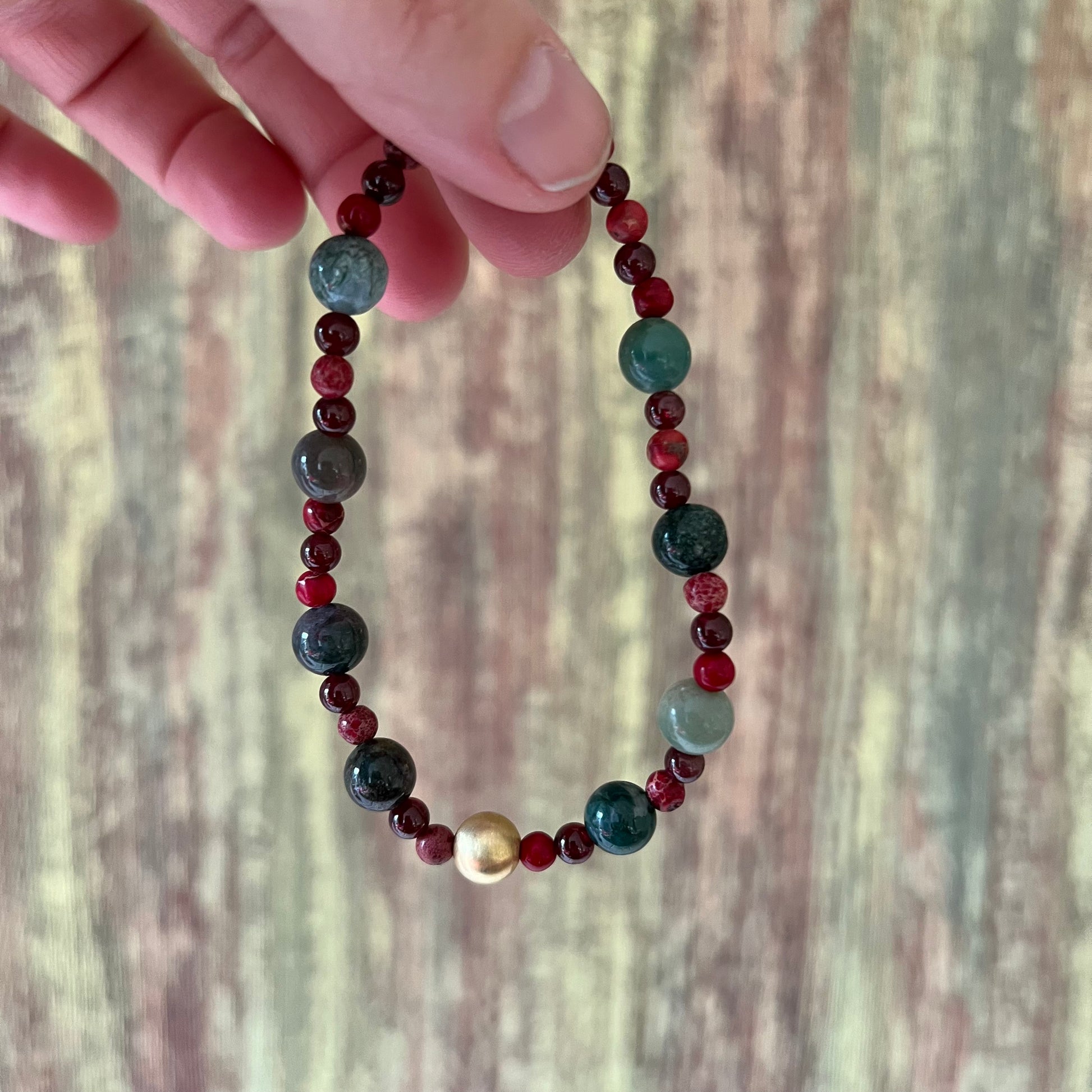 Waldkraft & Erdglut – Edelsteinarmband mit Moosachat, Granat, rotem Jaspis und vergoldeter Silberperle - Armband