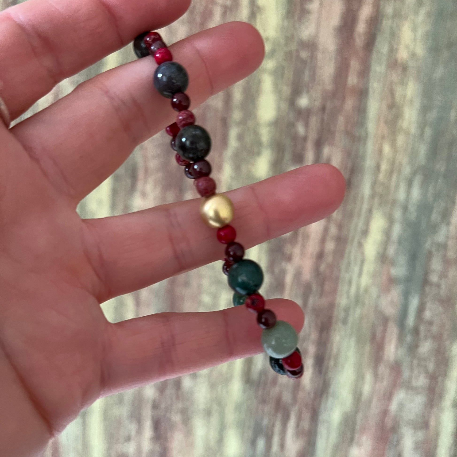 Dieses Edelsteinarmband verbindet natürliche Tiefe, warme Erdtöne und feine goldene Akzente zu einem harmonischen Unikat. Der Moosachat in 8 mm bildet das Zentrum des Designs und zeigt seine charakteristische grün-marmorierte Struktur, die an Waldlandschaften erinnert. Ergänzt wird er durch zarte 4-mm-Granatperlen, deren tiefes Weinrot das Armband optisch erdet und zugleich einen edlen Farbkontrast schafft.