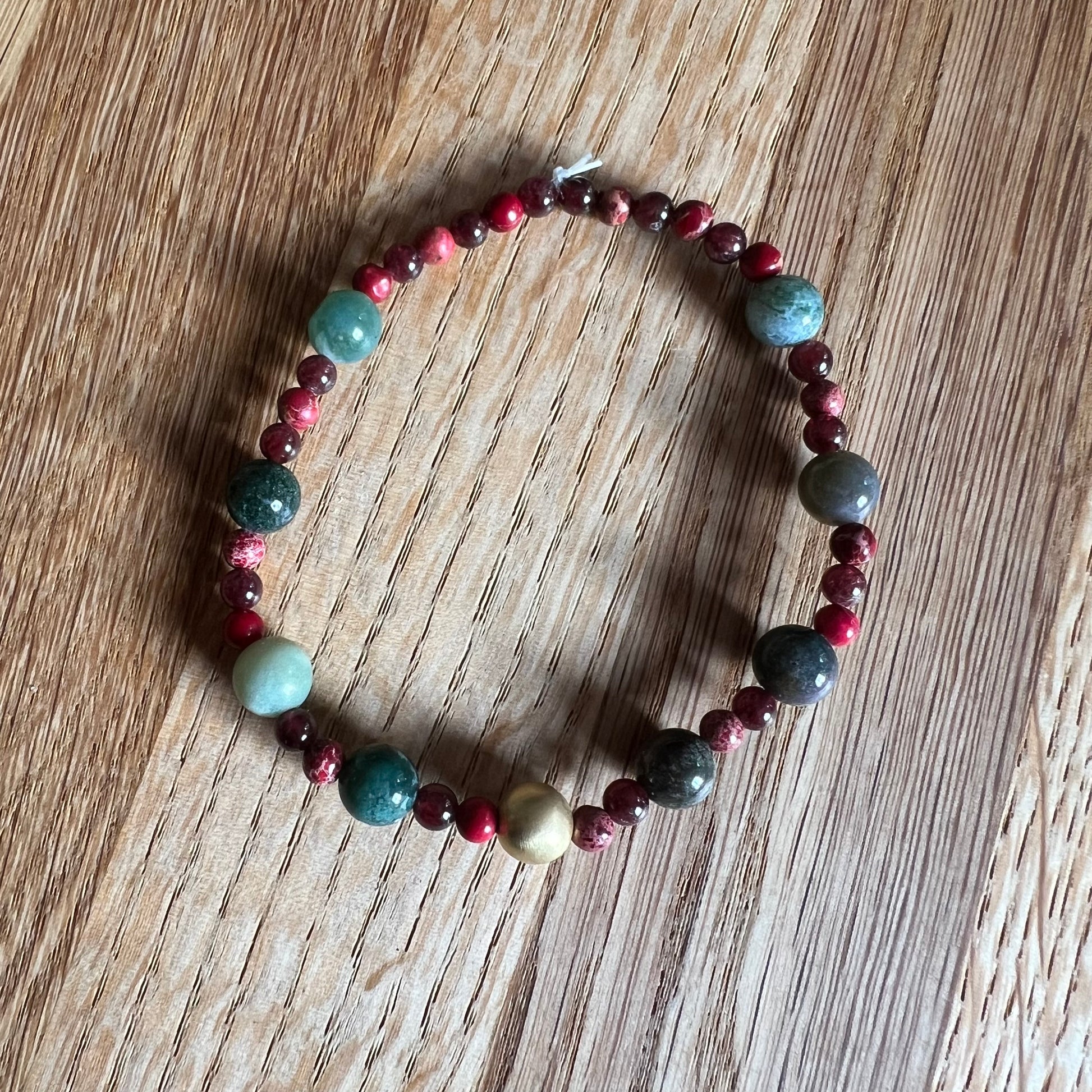 Der rote Jaspis in 4 mm bringt zusätzliche Wärme und natürlich wirkende Rost- und Erdtöne ein. Die Kombination der drei Steine erzeugt ein stimmiges Farbspiel zwischen Grün, Rot und warmen Naturtönen.